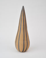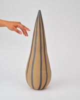 Tall Drop is an original, one of a kind sculptural artwork. A tall organic form balances on a flat, concealed foot and features end to end black iron oxide atomic stripes and natural clay. The piece was made using wheel throwing and hand building techniques, as part of Belinda's 2023 Echo series.