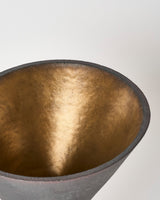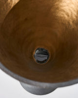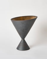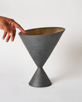 The Griever I, is one of a three part series of sculptural works created to represent an expression of a collective grief taking inspiration from the fable of the Banshee and her roots within the Irish tradition of Keening. Each of the Grievers was made predominately on the potters wheel, finished on the outside with a deep black iron oxide, and on the inside with a dark gold glaze leading down to the depths of the conical form where a reflective pool of glass was fired in place.