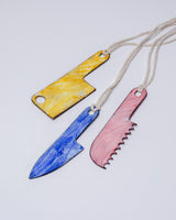 A pink bread knife shaped pendant hung from a hang braided waxed cotton cord. Painterly and gestural surface. Can be ordered in any other colours.