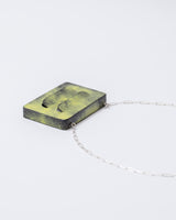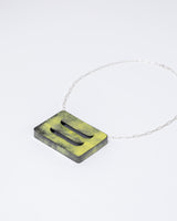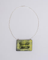 Grating is a series of wearable objects which reimagine a common household form to find whimsy in the ordinary. Rectangle pendant with two slicing 'blades'. Mild steel coated in bright green vitreous enamel. Suspended from sterling silver chain. The form is cut and shaped by hand and the enamel on steel creates a completely unique surface.