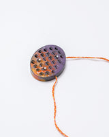 Grating is a series of wearable objects which reimagine a common household form to find whimsy in the ordinary. Oval pendant with cheese-grater texture on surface. Mild steel form is coated with purple, red and orange enamel. Three pearls on front. Hung from a hand-braided waxed cotton cord. The form is cut and shaped by hand and the enamel on steel creates a completely unique surface.