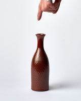A large budvase with an intricately hand carved surface, finished in a rich burgundy glaze.