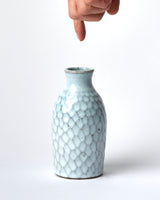 A medium budvase with an intricately hand carved surface, finished in a pale icy blue glaze.