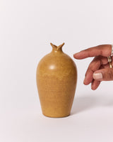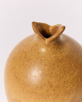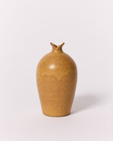 A medium podvase with an intricately hand carved surface, glazed in a golden brown satin matte glaze.
