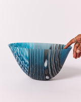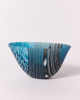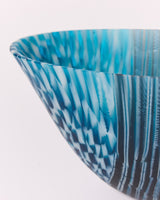 Aqueous Blue #39 is an art piece using the Murrini technique. It is made with sheets of coloured glass that are stacked together then heated and stretched. Its subtle organic shape is formed in a kiln using gravity and heat.