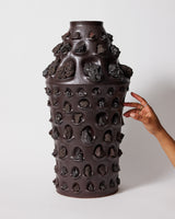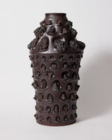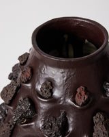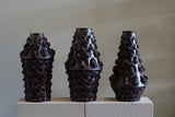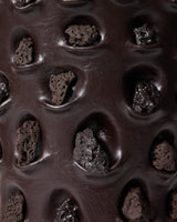 To stay engaged with the climate emergency without getting stuck in despair or outrage I need to plan and make work about the most unbearable information. This work encompasses my material research and development addressing social and environmental challenges in the ceramic industry and climate politics. It’s now well documented that mitigating climate change requires political action, not individual behavior change. A tongue in cheek reference to Australian Slang, Triple Cooked features three coil-built vessels made of recycled clay, named after three recent climate headlines. They’re glazed using only reclaimed landscaping basalt. The same rock is broken into pieces, tumbled and molded into each vessel before a single firing. This work is inspired by the aesthetics of fossil fuels, in particular coal rocks and deformed landscapes. It aims to spread political awareness using the moments of pause and curiosity created by innovative craftsmanship. – Claire Ellis