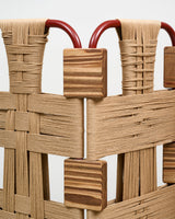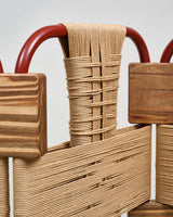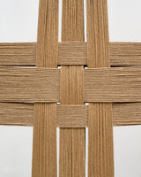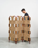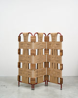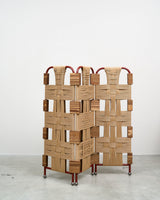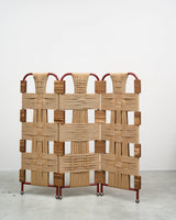 Small room screens have long been used in religious and ceremonial contexts as thresholds between the divine and the ordinary, their use spanning across a range cultures and faiths for more than two thousand years. Drawing on this heritage, the woven composition references religious iconography through two abstract sunburst forms that flank a restrained central weave with a trio of patterns; a woven triptych.