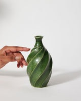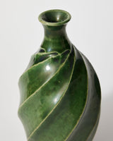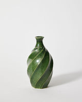 A sake bottle with twisted body and vertically faceted surface finished in Terunobu Hirata's oribe green glaze.