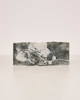 Each sculptural tile is made of waste glaze, oxide and porcelain material blends. The blue-grey hues are generated from the presence of cobalt and copper in the accumulated waste glaze from class experiments conducted at the School of Clay and Art, where the artist works as a teacher. There is waste material in both the clay body and the surface. All images were printed in waste glaze pre-firing with a paper lithography technique, then single fired.