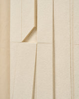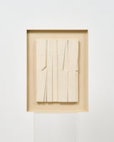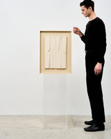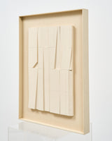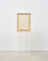 The making process is a conversation between intention and intuition. I divide a clay slab into a grid and work left to right, top to bottom, cutting and shaping without pre-planning. Much like writing, marks emerge in response to what comes before, each decision shaping the next. Unlike a written text however, the forms resist translation; they can’t be deciphered, repeated, or reconstructed. What is captured is shaped by the conditions and the moment of its making, always in flux and shifting from one work to the next.After firing, framing gathers the ceramic fragments and holds them as an integrated whole.