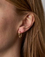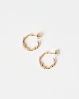 Small solid gold hoop earrings with a sculpted, organic texture inspired by weathered vineyard vines. A refined staple with a rugged edge, in a classic everyday size
