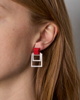The Square Drop Earrings feature hand-faceted pieces of eye-catching red Corian on top of engraved silver drops. The components are hinged allowing the silver to sway freely with the wearer's movement.