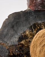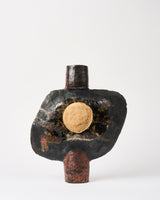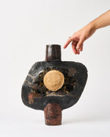 Material: Raku clay, raku glazes, black sand, aluminium, reduction smoke chamber, gold oil-based paint, and lacquer coat. This work is not waterproof.