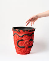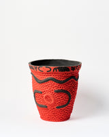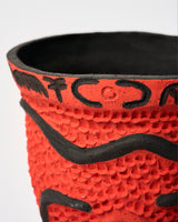 Josina hand builds her pots. The red represents the fires the bombs caused, and the grey represents the smoke. The texture and detail on the exterior of her pot conveys story of the smoke and how it travelled and stretched across the APY Lands.