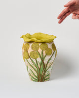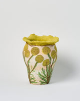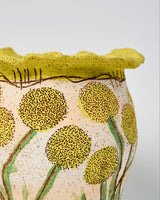 LeShaye fondly remembers the elder women taking her out on bush trips whilst Sandra was at work, particularly Milatjari Pumani and Ngupulya Pumani. “We would go out and they would teach me about traditional life”. LeShaye learnt to weave, make punu and hunt for witchetty grubs and other bush medicines. LeShaye was taught about the dreamtime stories around Mimilli, which would later inform her artworks. LeShaye’s colourful ceramic vessels are decorated with plants native to Bucket Well, a homeland not far from Mimili community where she grew up.
