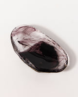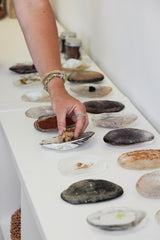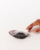 The glass Dhanggal takes its form from the freshwater mussel shell, a large bivalve mollusc. Handmade in collaboration by artisans at Canberra Glassworks, each piece is individually cast using an 80-year-old shell collected from a parched riverbed within the Murray Darling Basin in Northwestern New South Wales. This shell was one of more than 2 million mussels that perished between 2017 - 2020 at the height of the drought. Lucy sees each individual shell as a record of time and place, a tactile vessel etched with memory. Ranging from translucent to opaque, black to white, pure to gritty, this subtle yet striking collection has been designed to convey a sense of fragility within our natural world and importance of balance and belonging.