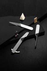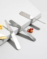 Carefully crafted, they play on the manipulation of a single flat sheet of metal through a combination of folds, to create a functional and intriguing piece of cutlery - a deceptively simple structure for the simple pleasure of savouring cheese.