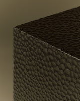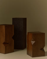 Crafted from walnut and blackened solid timber, each plinth continues the material exploration the studio is renowned for, presenting timber in a way that is compositionally architectural yet cloaked in the texture of enchanted. A marker signalling the way to safety or a totem upon which a treasure is placed, each one rises from the ground, evoking a sense of growth and connection to the forest. Each plinth celebrates the craftsmanship and origin of the wood from which they are shaped while presenting a striking contrast between their clean geometric lines and the organic texture of the ham-mered timber, reminding us of the towering trees they once were.