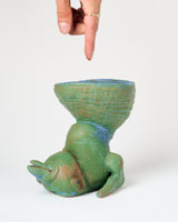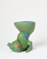 A ceramic sculpture of an upside down abstracted dolphin morphing into a vessel