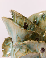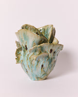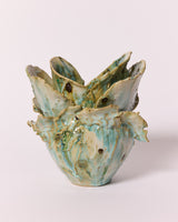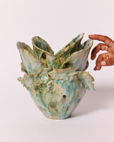 This work is made using a combination of wheel throwing and handbuilding techniques. Found materials such as sea glass, seeds and rocks are embedded in the clay to create a unique surface texture. It is water tight and can be hand washed in warm water.