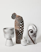 Through this group of silver clay works, Maia Kreisler explores Māori concepts of creation and being. She picks up on the thoughts of her mentor, Wi Taepa ONZM, who has drawn an analogy between the clay pot and the fundamental structures of te pō (the realm of darkness) and te ao mārama (the realm of life and light), respectively represented by the inside and outside of the vessel. The movement from te korekore (the realm of potential being) to te whaiao (the realm of coming into being) and te ao mārama is evoked through the use of black, silver, and white. This primordial, cosmic process becomes a figure for the generative force underpinning Kreisler's work with hand, clay, and fire.