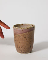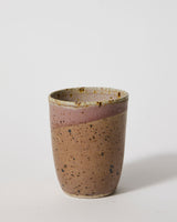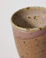 A small, narrow vessel with multi-tone glaze and subtle speckles. This stoneware fired beaker was thrown on the wheel and graced with the colours of the sunset due to the small amount of copper in the glaze and a reduction firing. It can be washed in a dishwasher.