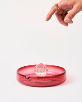Two variants were designed - the 'Juicy Bowl' is a solid glass 'juicer' mounted to a low bowl that collects the juice, while the 'Juicy Junior' is a handheld variant. The solid juicer element of each piece highlights the optical qualities of glass and provides a sturdy point of contact for juicing. Each piece is handblown at the Jam Factory in South Australia.