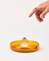 Two variants were designed - the 'Juicy Bowl' is a solid glass 'juicer' mounted to a low bowl that collects the juice, while the 'Juicy Junior' is a handheld variant. The solid juicer element of each piece highlights the optical qualities of glass and provides a sturdy point of contact for juicing. Each piece is handblown at the Jam Factory in South Australia.