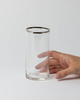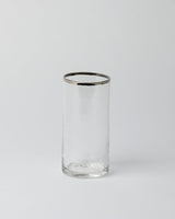 Hand blown tall tumbler, finished with a delicate silver rim. The perfect glass for your tall cocktail.