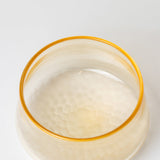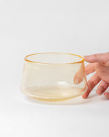 Small serving bowl in lemon yellow glass, with cold-carved battuto pattern on base. A unique bowl.