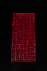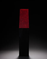 "Rugged Terrain emerges from the tension between beauty and destruction, resilience and fragility. A charred hardwood base rises upward, following the line of a thin, angled plane of fused glass. From a distance, the glass burns with a striking, fiery red intensity, evoking I and ignited. As you draw closer, intricate networks of circles, squares, and white crosses reveal themselves—patterns reminiscent of maps, territories, and the scars of upheaval.