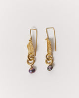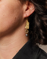 Heavily textured and gold plated sterling silver textured earrings with link detail and black fresh water pearl. 9ct yellow gold ear wires.