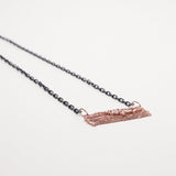 Heavily textured rose gold pendant, attached to an oxidised sterling silver chain.