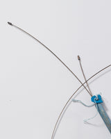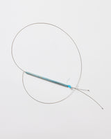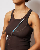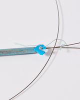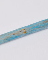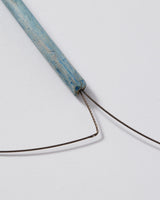 For this piece, I used a driftwood reed found on the shores of Lake Taupo, painted with gouache in cerulean blue. To honour and emphasise the fragile nature of the reed, a fracture incurred during travel is repaired with gold foil (in the spirit of Kintsugi). The adjustable toggle is made with silk, silver, and a fragment of marine plastic.