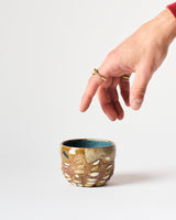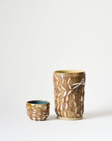 This piece is a one off, unique, and functional tumbler. Each one a unique object, made intuitively with love. When used, they create a moment for connection – with someone else, with the moment, with the sustenance and beauty they are holding space for.