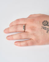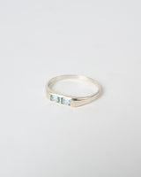 The AYXA Ring is crafted from recycled sterling silver in an angular, brutalist structure. It features two emerald-cut Swiss topaz stones set side by side.