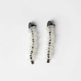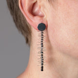Drop earrings from the Coral Series featuring oxidised sterling silver studs with hand cut polypropylene discs layered between black pearls.