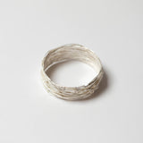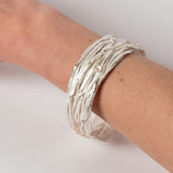 A wide cuff style bangle in Shimara Carlow in wrapped sterling silver, studded with acorn cups.