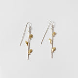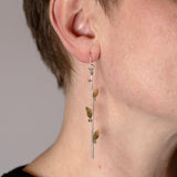 A delicate pair of drop earrings with sterling silver leaves. Each leaf is studded with gold and a white diamond for subtle sparkle