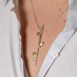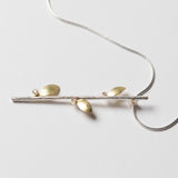A fine snake chain with a branch pendant in sterling silver with three 18ct gold leaves. White diamonds adorn each gold leaf.