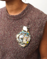 My jewellery works a little against an agreed definition of value and of modernity, that sees minimalism as an indication of modernity or even as a requirement. Austerity and minimalism I may often like, but never apply in my own work. My work seeks out decorative and design elements that tend to challenge that notion of modernity; and the materials I use challenge the expectation of value and worth. They are worthless, which allows me to use more of them and to experiment widely, without the restraint of cost. My work, made of non-valuable materials, explores jewellery with an eye to femininity, desirability and history, with an aesthetic and cheekiness which is I think my own. My materials are lightweight, I make laminates, I use plastics, shell, fabrics and all manner of refuse as extravagantly as I can.