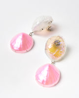 The Plastic Lustre Drop Earrings reimagine shell jewellery for the 21st century. They are in iridescent pearl and pink, made from thermoforming plastics and the industrial process of vacuum forming. Do not submerge in water.
