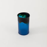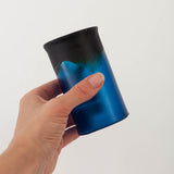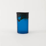 Narrow blue vessel with mesmerising dark rim pattern, made from algae bioplastics.