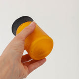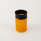 Narrow, yellow vessel with dark rim made from algae bioplastics.