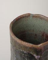 Materials: thrown reclaimed stoneware, hand carved, black pigment, porcelain slip