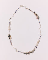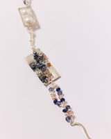 Material: sterling silver, freshwater pearls, sapphires, tourmaline, lapis lazuli, fluorite, peach moonstones, chalcedony gemstone beads and silk