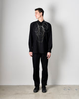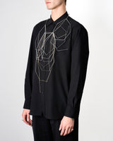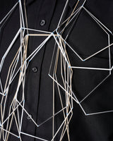 The neckpiece consists of two parts which can also be worn individually: a golden long chain ending in droplets, like sunlight on water, and the other with a strong contrast in tones, woven from shapes resembling trees with bare branches, or thin sheets broken ice. Fabricated from lightly coloured glass capillary tubes, the piece is fragile and almost weightless, but has a strong audible presence. When worn, its layers move with the wearer and remind them about the power of a seasonal change.