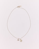 Ball chain necklace featuring a small bubble dome pendant and disc pendant with a handmade pearl clasp.