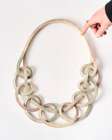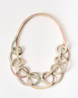 Double Loop (2025) explores an innovative making process developed over many years of experimentation that transforms a humble material into jewellery forms. Using cotton rag paper that is soft to touch yet pliable to work with, thin strips are woven onto steel cable according to sequences of millimetre measurements to create long strands of tightly compressed folds that are seamlessly inter-looped. This making method seeks a sense of movement and visual harmony through the intertwined configuration and synthesis of the two strands further enhanced by the rhythmic effects of grey, white, green and pink colours, gradually interspersed throughout the work. Time is imbued in the labour-intensive processes that highlights the value of craft skill and draws attention to the beauty of pattern and ornamentation.
