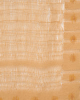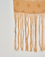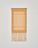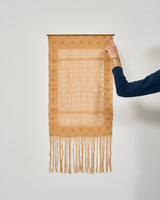This intricate weaving resonates with the tangible space it occupies, woven during a period of profound transformation and renewal. As the maple tree outside began to shed its leaves, a generous light bathed the loom, casting dappled patterns on the floor and pitched ceilings. In a process of reflection, it became an ode not simply to what is made, but to what is left untouched in the lace-like spaciousness. Framed by the subtle sun-inspired uses of paint in the border, the weaving celebrates of the space itself as a vessel for boundless possibility.